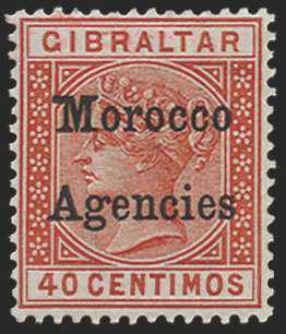 £175.00| /Morocco Agencies 1899 40c orange-brown, type 2 De La Rue overprint, variety Broad top to 'M', SG13b. A fine mint example with original gum, from le...