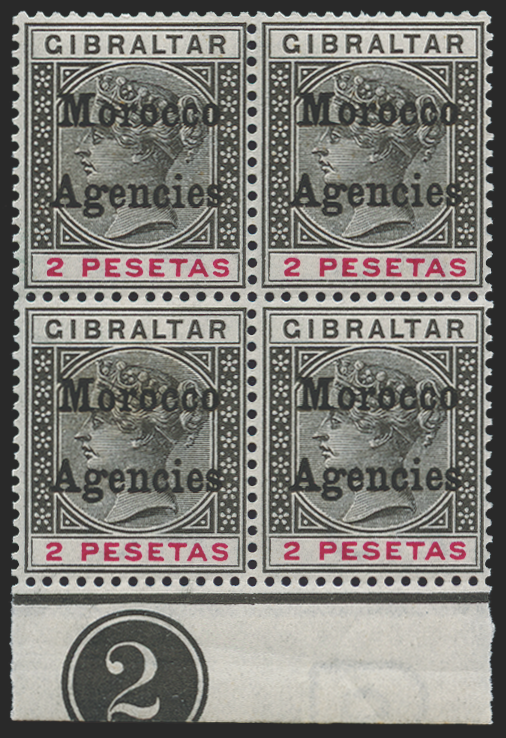 £275.00| /Morocco Agencies 1899 2p black and carmine, type 2 De La Rue overprint, lower marginal block of 4 with plate number '2', SG16. A stunning unmounted...