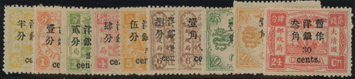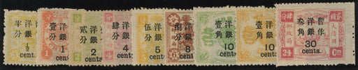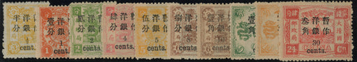 Sale SaleChina 1897 set of 10 to 30c on 24ca rose-carmine small figure surcharge on Dowager Empress, SG37/46£3,150.00| /China 1897 (Jan) set of 10 to 30c on 24ca rose-carmine small figure surcharge on 60th Birthday of the Dowager Empress (1st printing), SG37/46. A fi... View full details£3,150.00| /Sale