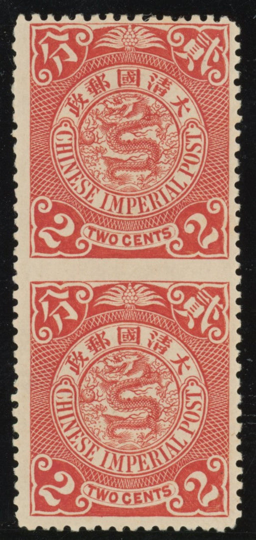 Sale SaleChina 1900-06 2c deep red error, SG123c£400.00| /China 1900-06 2c deep red, no watermark, vertical pair, error imperforate between, SG123c. A fine mint example with part original gum. The upper st... View full details£400.00| /Sale