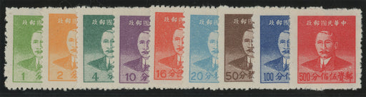 Sale SaleChina 1949 Sun Yat-sen silver yuan set of 9 to 500c scarlet, SG 1348/56£500.00| /China 1949 (8 June) Sun Yat-sen silver yuan set of 9 to 500c scarlet Hwa Nam printing, SG 1348/56. A fine and fresh unused set without gum as issue... View full details£500.00| /Sale