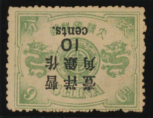 Sale SaleChina 1897 10c on 9ca grey-green large figure surcharge error, SG83a£1,500.00| /China 1897 (May) 10c on 9ca grey-green large figure surcharge, 1½mm spacing, on 60th Birthday of the Dowager Empress (third printing), error surcha... View full details£1,500.00| /Sale