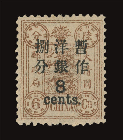 Sale SaleChina 1897 8c on 6ca chocolate large figure surcharge, SG74£3,000.00| /China 1897 (May) 8c on 6ca chocolate, large figure surcharge, spaced 1.5mm on first printing, SG74. A fine and fresh mint example with large part o... View full details£3,000.00| /Sale