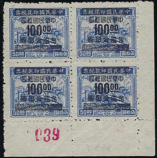 £4,750.00| /China 1949 (Jan) $100 on $50 dark blue type II, Chung Ming printing, SG1146a. A lower right corner block of 4 with sheet number '039'. Very fine ot...