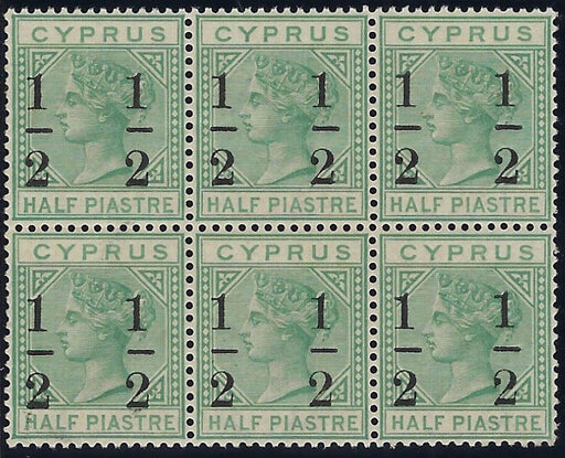 £4,250.00| /Cyprus 1886 (June) '1/2' on 1/2pi emerald-green, SG29 wmk CA, type 10 surcharge with 8mm space, block of 6 (3x2) with bold surcharge, o.g. (Five st...
