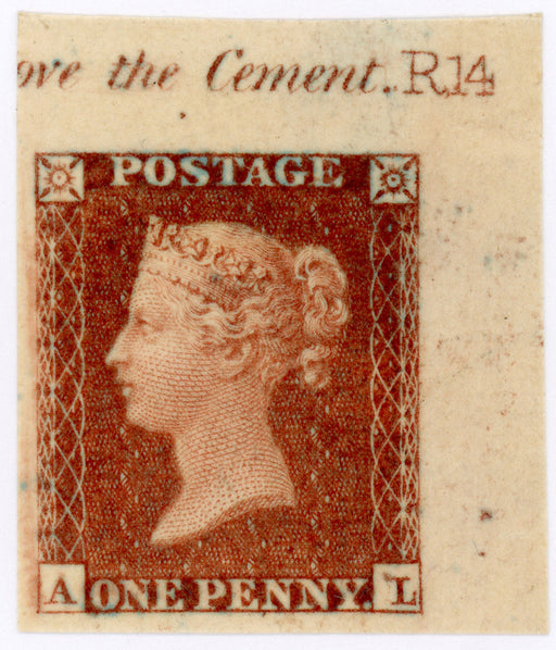 £7,000.00| /Great Britain 1854 1d Deep red brown Plate R.13, SG17var. A superb unused top right hand corner marginal imperforate imprimatur lettered AL, showin...