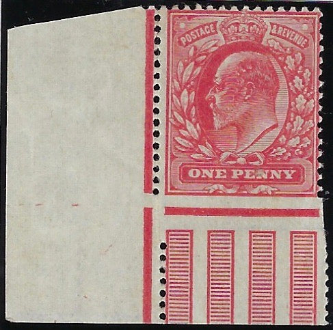 £4,800.00| /Great Britain 1902 King Edward VII 1d Scarlet, SG219var. A very fine unused, with original gum, bottom left hand corner marginal example showing va...