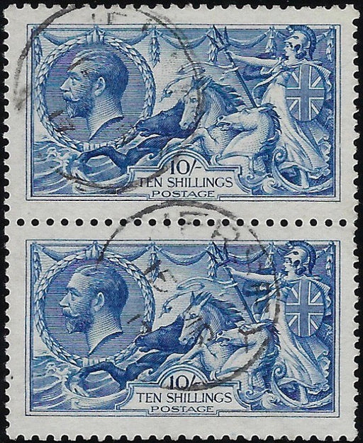 £4,750.00| /Great Britain 1915 10s Bright "Cambridge" blue. SG411var. Very fine used vertical pair printed by DLR, couple of blunt perf at right of lower stamp...