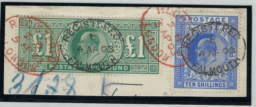 £2,250.00| /Great Britain 1902 10s ultramarine and £1 dull blue green, SG265/6. A superb used piece both stamps neatly tied by Falmouth/Registered datestamps i...