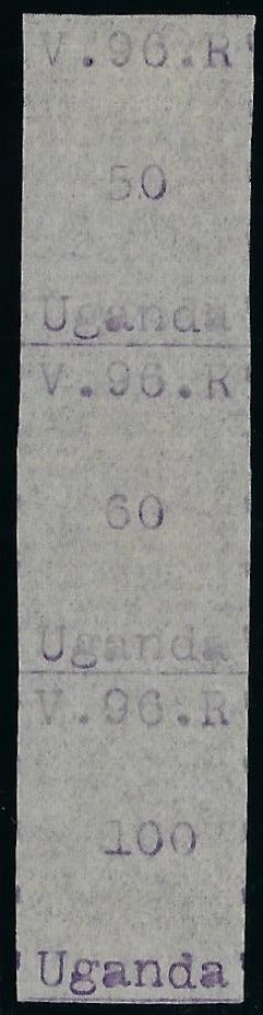 £3,500.00| /Uganda 1896 (June) Typewritten 'V.96.R (type 3) 50(c)+60(c)+100(c) SG51/3 Violet. se-tenant vertical strip of 3, unused with good colour and boarde...