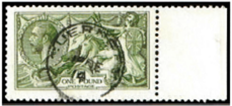 £1,400.00| /Great Britain 1913 £1 Green "Seahorses", SG403 A very fine used right hand marginal example neatly cancelled by a Guernsey circular date stamp for ...