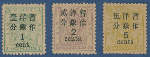 £2,750.00| /China 1897 (May) large figure surcharges spaced 1½mm on 'Small Dragons', set of 3 to 5c on 5ca olive-yellow, SG66/68. A fine quality mint set with ...