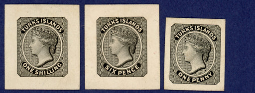 £7,500.00| /Turks Islands 1867 1d, 6d, 1s, set of three die proofs in black on India paper affixed to a card (1d 23x28mm, 6d and 1s each 29x33mm), SG1/3. A ver...