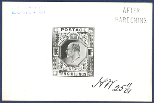 £3,800.00| /Great Britain 1901 10s die proof, SG265var. A very fine and fresh example printed by De La Rue in black on white glazed card (92x60mm) endorsed "BE...