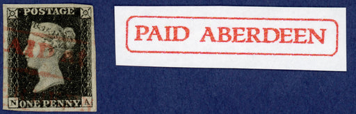 £7,500.00| /Great Britain 1840 1d Black Plate 7, SG2. A superb used large four margin example lettered 'NA', beautifully cancelled by a crisp "PAID ABERDEEN" b...