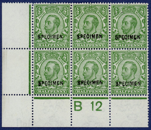 £3,750.00| /Great Britain 1912 ½d green (Die 2, Watermark Simple Cypher), SG344var. A very fine unused B12(c) corner marginal control block of six, with origin...