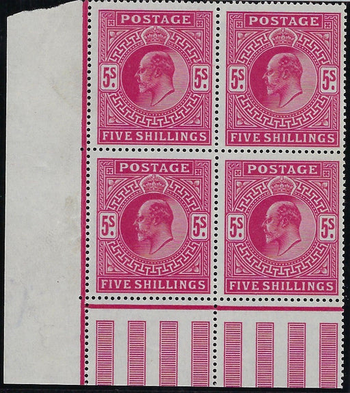 £3,000.00| /Great Britain 1902 5s Deep bright carmine, SG264. Very fine and fresh unmounted mint with full original gum bottom left hand interpanneau marginal ...