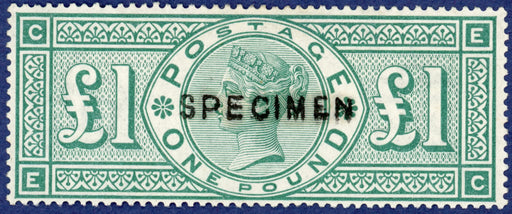 £1,100.00| /Great Britain 1891 £1 green, SG212var. A superb unused example with original gum lettered 'EC', overprinted "SPECIMEN" type 11. Very scarce in su...