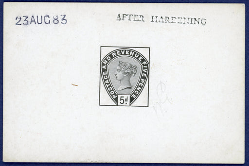 £1,500.00| /Great Britain 1883 5d Die Proof, SG193var. A very fine example printed by De La Rue in black on white glazed card (92x60mm) without corner letters...