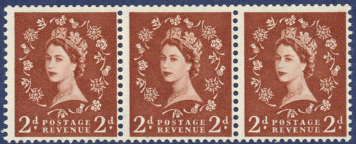 £1,350.00| /Great Britain 1958 2d light red brown "Dollis Hill Phosphor Trial", SG573var. A very fine perforated horizontal strip of three on gummed crowns wat...