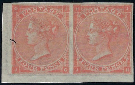 £7,000.00| /Great Britain 1863 4d Pale red PL4, SG82a. Very fine unused o.g. imperforate bottom left hand corner marginal pair lettered JG-JH. Scarce. BUY NOW...