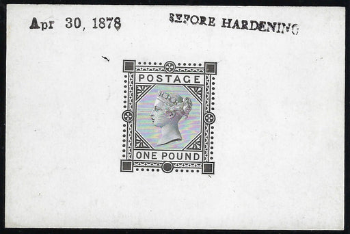 £4,600.00| /Great Britain 1878 £1 Die Proof. SG129var. Very fine example printed in black on white glazed card (91x60mm), dated at upper left "Apr 30, 1878" an...
