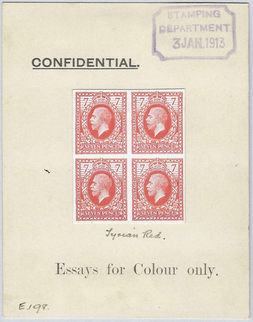 £8,500.00| /Great Britain 1913 7d Eve's Wreath design colour essays, SG387var. A very fine ungummed imperforate block of four essays (Fig 30a) in tyrian red on...