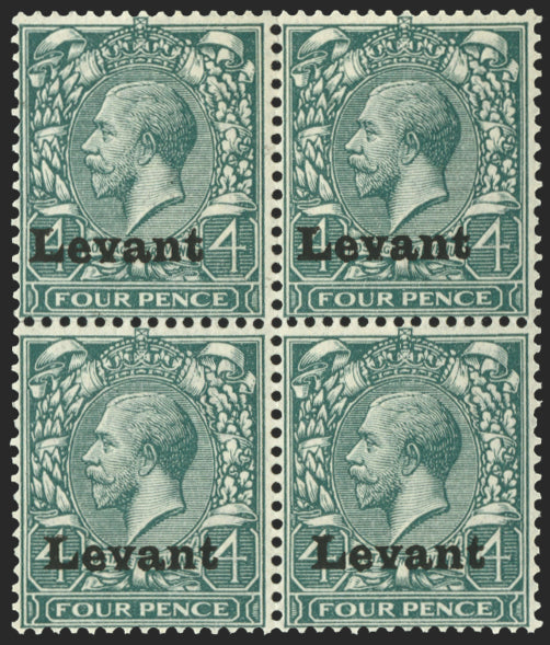 £1,000.00| /British Levant 1916 'Salonica' 4d grey-green, type S1 overprint, block of 4, all with inverted albino overprints on the gummed side, SG5var. A bril...