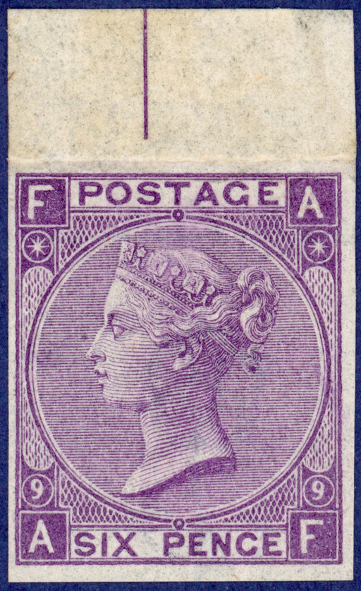 £3,800.00| /Great Britain 1869 6d mauve Plate 9, SG109var. Very fine unused, with original gum, top marginal imperforate imprimatur lettered AF. Very scarce, o...