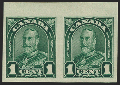 £1,500.00| /Canada King George V 1930-31 1c green, die II, upper marginal horizontal pair, ERROR IMPERFORATE, SG289da. A fine and fresh mint positional pair w...