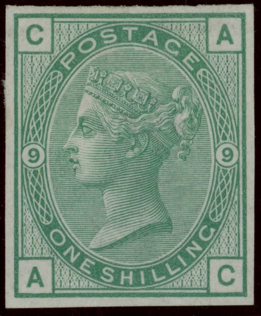 £3,500.00| /Great Britain 1875 1s green PIate 9 imprimatur, SG150var. A very fine unused, with original gum, imperforate imprimatur lettered 'AC'. A very scarc...