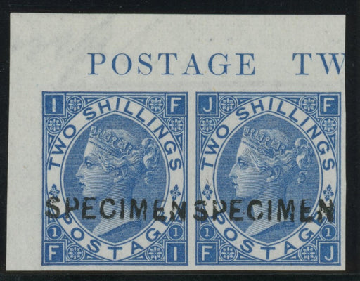 £1,000.00| /Great Britain 1867 2s dull blue Plate 1 Specimen, SG118var. A superb unused imperforate top marginal pair lettered FI-FJ, overprinted "SPECIMEN" ty...