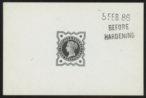 £1,250.00| /Great Britain 1886 ½d "Jubilee" die proof, SG197var. A very fine example printed in black on white glazed card (91 x 60mm), endorsed "BEFORE HARDEN...