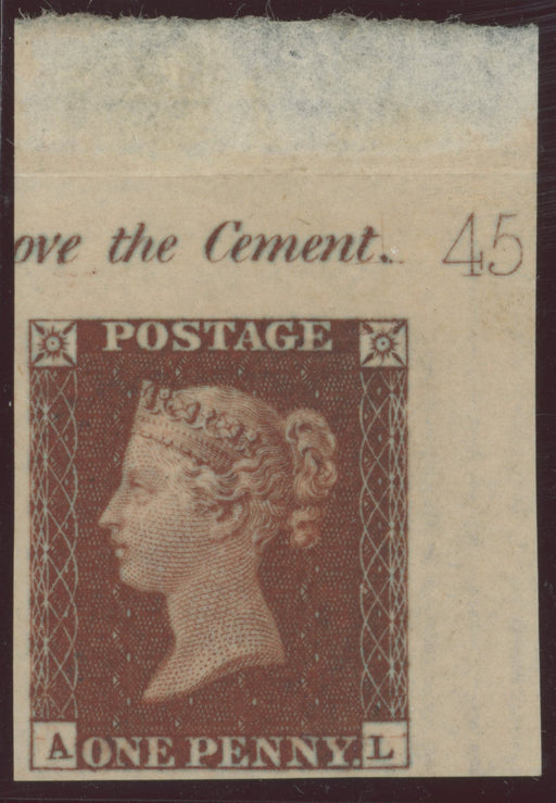 £4,500.00| /Great Britain 1841 1d deep red brown Plate 45 imprimatur, SG8var. A superb unused top right hand corner marginal imperforate imprimatur lettered 'A...