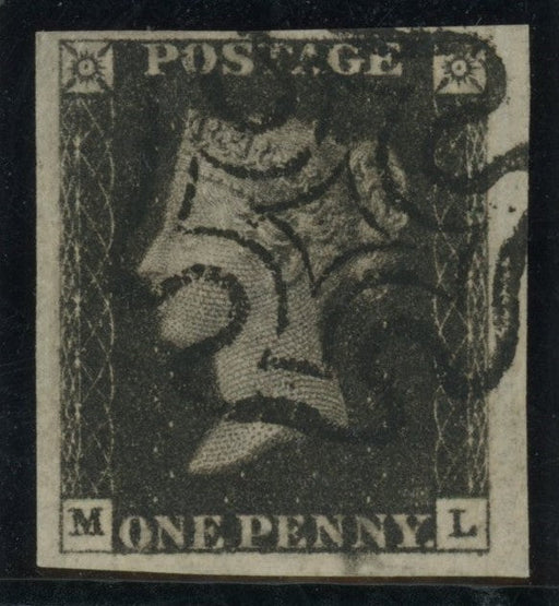 £500.00| /Great Britain 1840 1d black Plate 8, SG2. A superb used good to huge four margin example lettered 'ML', neatly cancelled by a crisp strike of a bla...
