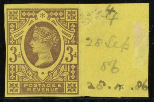 £800.00| /Great Britain 1887 3d purple/yellow "Jubilee" imprimatur, SG202var. A superb unused, with original gum, right hand marginal imperforate imprimatur ...