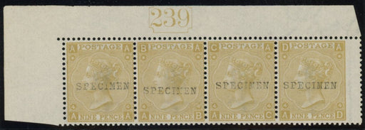 £2,750.00| /Great Britain 1867 9d straw PIate 4 Specimens, SG110s. Superb unmounted mint, with full original gum, top left hand corner marginal strip of four l...