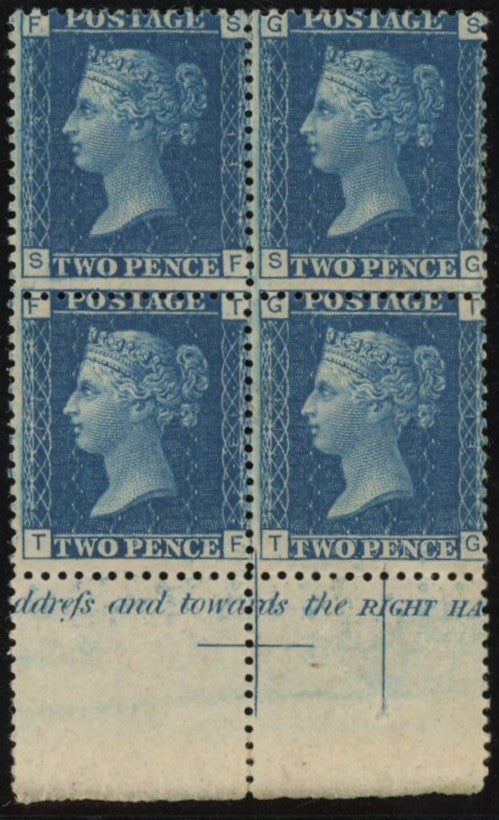 £2,500.00| /Great Britain 1869 2d deep blue Plate 13, SG47. Very fine and fresh unused, with original gum, bottom marginal block of four showing part sheet ins...