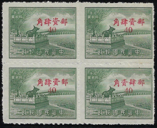£800.00| /China 1949 (20 Aug) 40c grey-green (Bronze Bull), SG1359/59a, block of 4, lower right stamp showing second and third characters of surcharge transp...