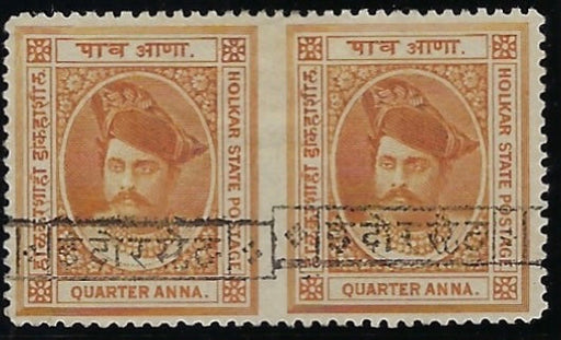 £1,250.00| /Indian Feudatory States Indore 1889-92 ¼a orange "Maharaja Shivaji Rao Holkar", SG5a. Horizontal pair, error with imperforate between. Cancelled-to...