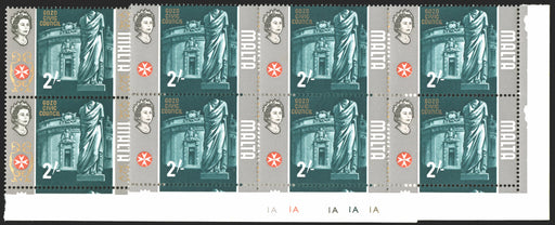 £550.00| /Malta 1965-70 2s 'Gozo Civic Council', error 'Gold (framework) omitted', SG343b. A pristine lower right corner block of 6 (3x2) with plate numbers ...