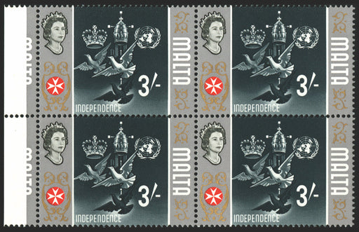 £750.00| /Malta 1965-70 3s 'Independence', error gold ('1964') omitted, SG345b. A Post Office fresh left marginal block of 4, unmounted mint with full origin...