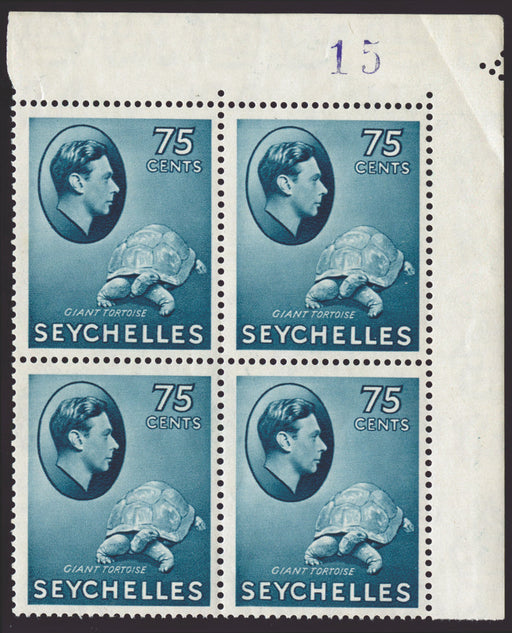 £425.00| /Seychelles 1938-49 75c slate-blue 'Giant Tortoise', upper right corner block of 4 with sheet number '15' in VIOLET, and showing a curious marginal ...