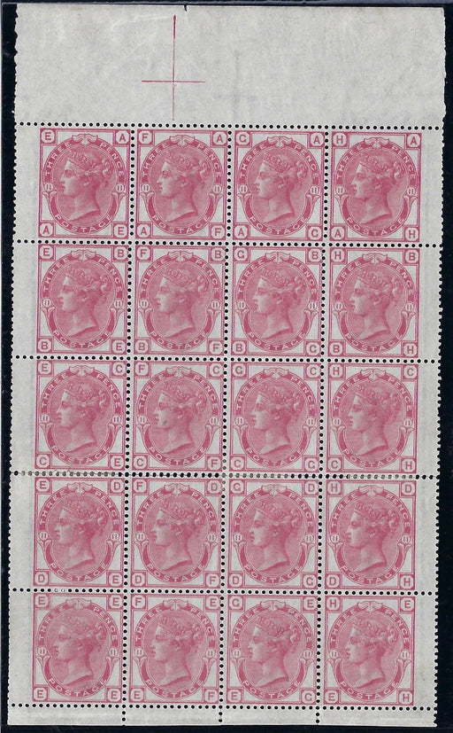 £13,500.00| /Great Britain 1873 3d Rose Plate 11, SG143. A magnificent unused, with original gum, pane of twenty lettered AE-EH. Perforations re-enforced betwee...