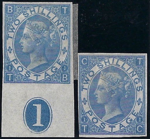 £15,000.00| /Great Britain 1867 2s dull blue Plate 1, SG118var. A very fine unused, with original gum, rejoined pair of imperforate imprimaturs lettered TB-TC f...