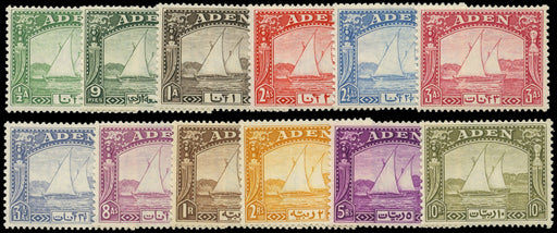 £1,450.00| /Aden 1937 (1 Apr) Dhow set of twelve, Watermark Multiple Script CA sideways, perforations 13x12, SG1-10, SG11a, SG12. A very fresh and fine unmount...