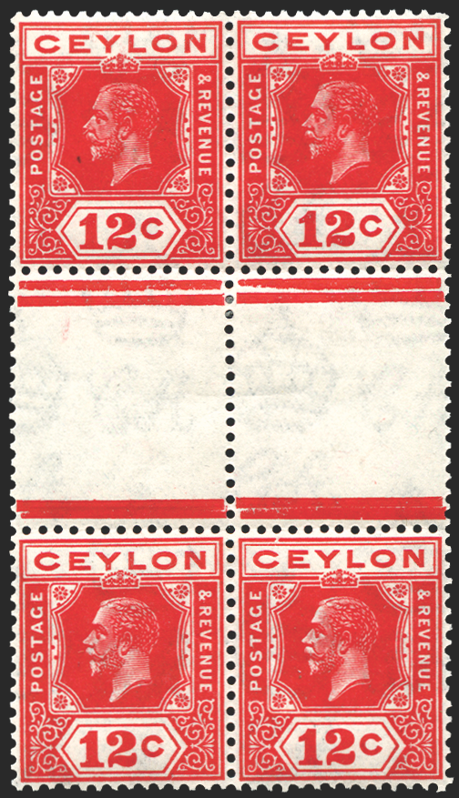 £325.00| /Ceylon 1921-32 Script watermark 12c rose-scarlet, vertical interpane block of 4 from November 1924 printing using combined plates '7' (upper) and '...