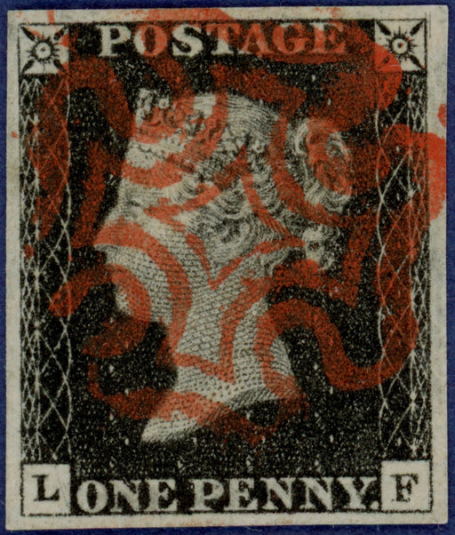 £525.00| /Great Britain 1840 1d black Plate 2, SG2. A very fine used large four margin example lettered 'LF' neatly cancelled by a complete upright crisp red...