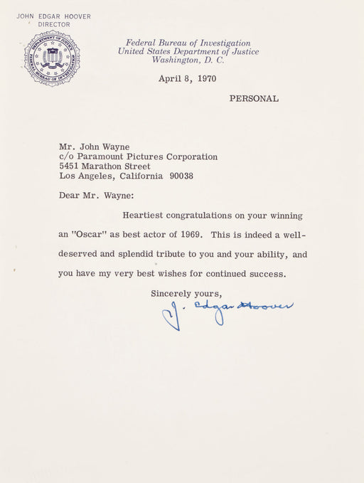 J. Edgar Hoover signed letter to John Wayne