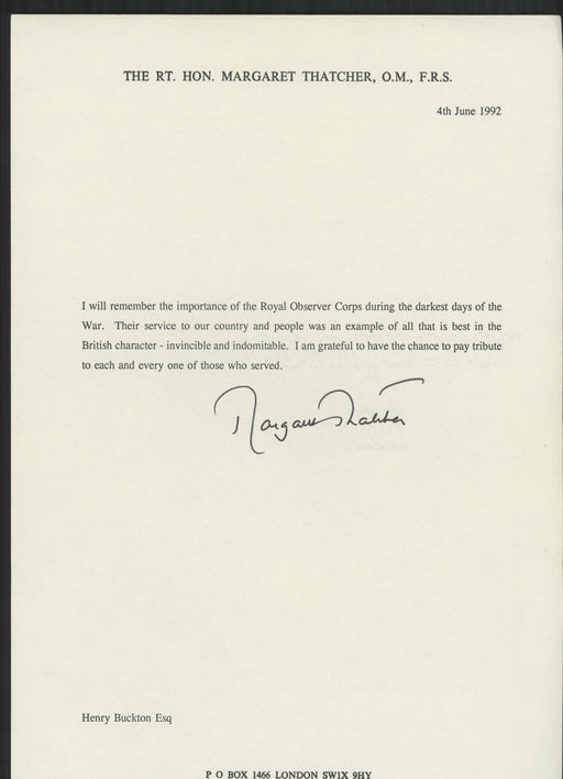 £4,500.00| /A typed letter beautifully handsigned by Margaret Thatcher praising the Royal Observer Corps. Signed letters from other prominent politicians and ...